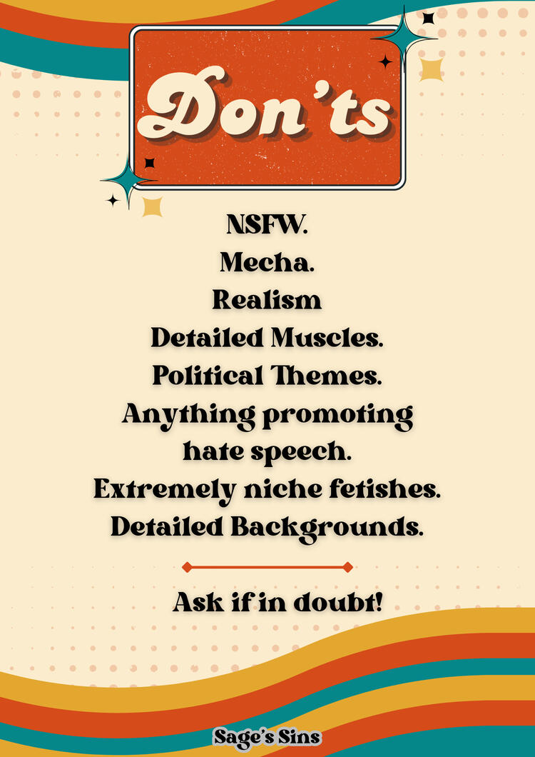 🌸 - I reserve the right to decline/reject or cancel a commission if the request goes against my personal beliefs or if the commission includes political or problematic themes,