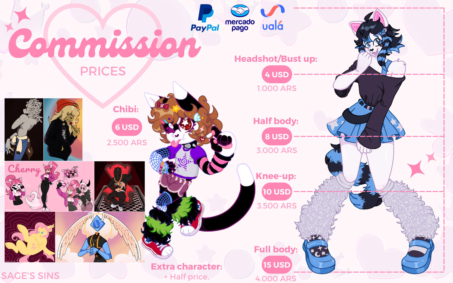 Character refs, Pinterest boards, moodboards, everything helps! Since I’m trying to get as close as possible to your vision ♡🌸 - Sketching can take from a couple of hours to 5 days, depending on the complexity of your piece.🌸 - The client will receive updates during every stage during the making of their art piece: sketch, line art, coloring, coloring of the lineart, rendering, background making, etc.🌸 - Revisions and asking for changes are only allowed during the sketching and line art stages, up to 10 changes during sketching (with change of position of the extremities or the entire pose, expression changes, outfit changes, addition of elements or props, etc), and 6 changes during line art (regarding the thickness of the lines, line overlap, etc).🌸 - All communication will be conducted via the medium you contact me by (Instagram, Facebook, X/Twitter, Bluesky, Telegram, UnVale, Discord or Email). I will not ask you to change the communication medium unless my devices break or I somehow lose access to those accounts.🌸 - Prices are non-negotiable, unless the commission is requested during published and active promotions or discounts.🌸 - All payments must be made either via PayPal (United States Dollars), Mercado Pago or Ualá (Argentinian pesos).🌸 - If the client fails to provide payment within the discussed timeframe, I will contact them, and if I receive no response or they fail to provide the payment, the commission will be canceled and their commission info will be removed from Trello.🌸 - Chargebacks will not be tolerated if I have already started the coloring process or if I finished the commission.🌸 - Commissions are completed in the order they are received, unless the commissioners request and pay a rush fee.